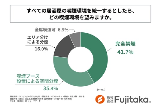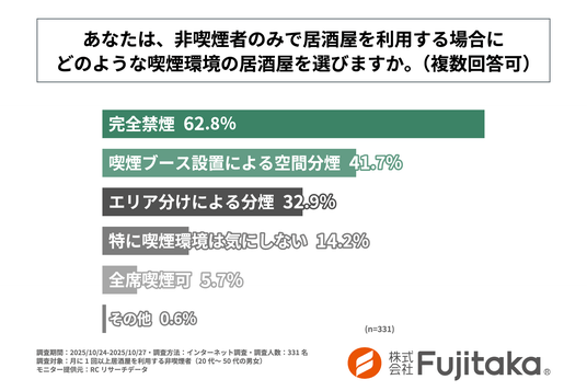 株式会社Fujitaka(本社:京都府京都市、代表取締役:高井 茂行)は、月に1回以上居酒屋を利用する非喫煙者(20代~50代の男女)を対象に「居酒屋の喫煙環境に関する非喫煙者の意識と実態調査」を実施しました。この調査から、月に1回以上居酒屋を利用する非喫煙者における、居酒屋の喫煙環境が店選びに与える影響や、同行者の喫煙習慣の有無によって選ぶ店の喫煙環境などが明らかになりました。