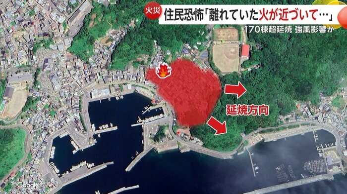 火災の発生から2時間以上がたちましたが、今もなお激しい炎が上がり続けています。私の後ろでは、複数の家から火の手が上がっているのが確認できます。