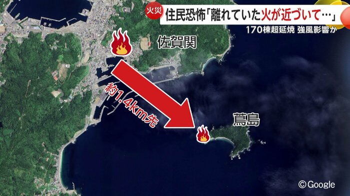 佐賀関から1.4kmほど離れた蔦島にも、火が燃え移った。