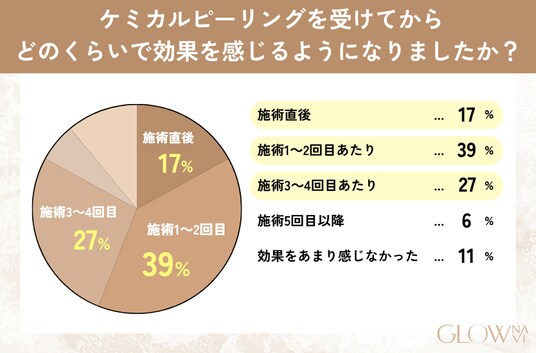 効果を実感し始めた時期については、「1~2回目あたり」と答えた人が最多でした。個人差はありますが、ケミカルピーリングは複数回の施術を重ねることでより高い効果が期待できるため、継続して通うことが重要です。