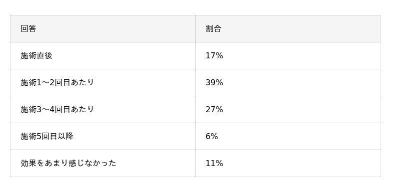 - 施術2回目までに効果を感じたと答えた人は全体の過半数