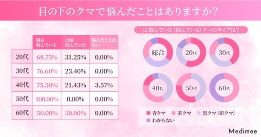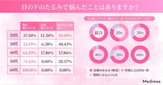 株式会社FoR/FoRINC.(本社:東京都渋谷区、代表取締役社長:高橋知暉)は、「美容クリニックをもっと身近に」をビジョンに掲げるサイト「Medimee」にて、美容医療に関する情報を発信しています。今回は、20代~60代の女性を対象に、「目の下のクマ取り・たるみ取り」に関するアンケート調査を実施しました(Medimee調べ)。以下はその結果です。