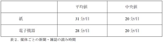 全回答者のうち紙で新聞・雑誌を読むことがある人の割合は30%、電子機器で新聞・雑誌を読む人の割合は38%であった。新聞・雑誌を読むことがあると答えた人の読み時間は(表2)の通り。
