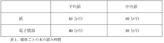 全回答者のうち紙で本を読むことがある人の割合は74%、電子機器で本を読むことがある人の割合は59%だった。本を読むことがあると答えた人の読み時間は(表1)の通り。