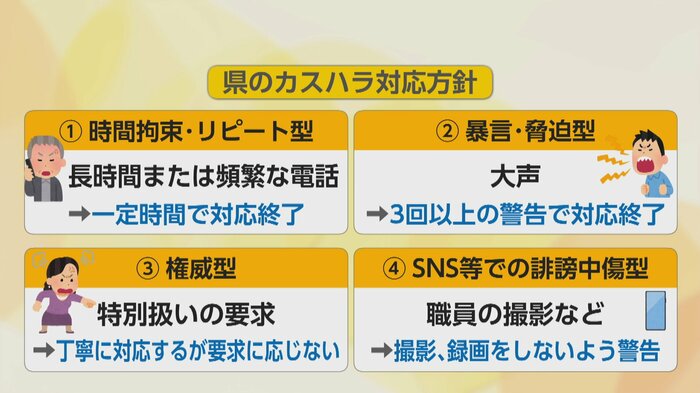 こうした状況を受け、県は今年2月にカスハラ対応指針を策定。カスハラを4つの類型(時間拘束・リピート型、暴言・脅迫型、権威型、SNS等での誹謗中傷型)に区分し、それぞれの対応策を示した。例えば、長時間の電話などには一定時間で対応を終了し、悪質な場合は警察や弁護士に相談するなどの法的対応を取るとしている。