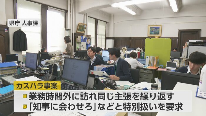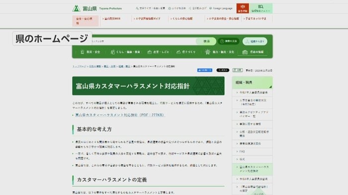 富山県庁では、窓口の業務時間外に連絡なしで訪れる、同じ主張を繰り返す、「知事に会わせろ」などの特別扱いを要求するといったカスハラ事案が確認されている。調査の結果、対象とした1年半の期間に全体の4分の3の部署でカスハラ事案が発生していた。