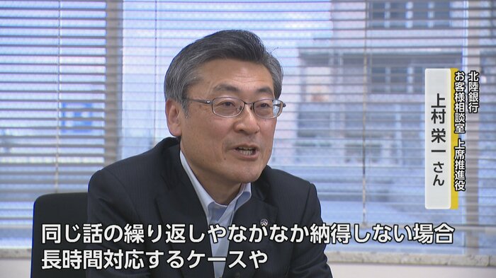 北陸銀行お客様相談室上席推進役の上村栄一さんは「長時間の拘束、同じ話の繰り返しやなかなか納得しないケースで、長時間対応するケースや暴言といった電話がかかってくる」と話す。