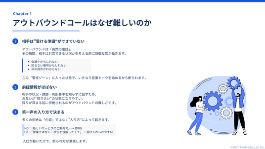 本資料は、「断られるのが当たり前」とされてきたアウトバウンド営業において、断られる原因は“話す内容”ではなく“入り方と流れ”にあるという事実を体系化。