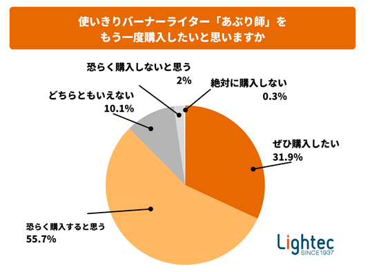 「あぶり師」の再購入意向については、「ぜひ購入したい」が31.9%、「たぶん購入したい」が55.7%となり、合わせて87.6%のユーザーが再購入を検討しています。