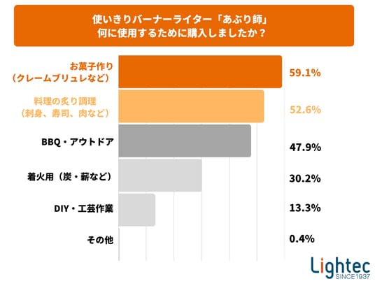 最初に、何に利用するために購入したかと尋ねたところ、「お菓子作り」(59.1%)や「料理の炙り」(52.6%)が上位を占めており、BBQ・アウトドア用途(47.9%)と並んで、食卓を豊かにする調理器具としての需要が非常に高いことが示されました。