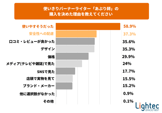 次に購入理由を尋ねたところ、「使いやすさ」(58.9%)が最も多く、次いで「安全性」(37.3%)、「口コミ・レビュー」(35.6%)が挙げられました。ユーザーが製品の機能性や安全性を特に求めていることが判明しました。