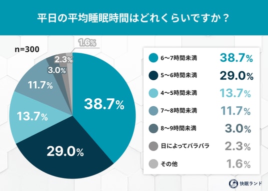 - その他:19.3%(家族の生活リズムに合わせている:5.9%、理想の睡眠時間は確保できている:4.1%、残業が多く帰宅時間が遅い:3.2%、早朝勤務などで睡眠時間が確保しづらい:2.0%、シフト勤務・夜勤があり生活リズムが乱れやすい:1.7%、通勤時間が長くて睡眠時間が削られる:1.7%、その他:0.7%)