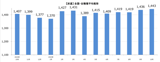 【派遣】全国・全職種平均時給は1,443円。前月比+7円。前年同月比+36円。