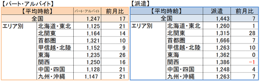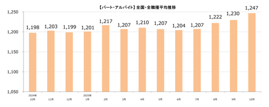 【パート・アルバイト】全国・全職種平均時給は1,247円。前月比+17 円。前年同月比+49円。