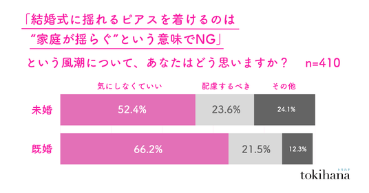 未婚者の52.4%、既婚者の66.2%が“気にしなくてもいい”と答え、アクセサリーは自由でいいという考えが読み取れました。