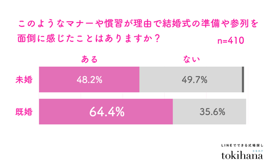 結婚式実施者の64.4%が「ルールや風潮が理由で準備や参列を面倒に感じたことがある」と回答。未婚者でも48.2%が「面倒」と答えており、“マナー疲れ”が式へのハードルを高めている実態が明らかになりました。