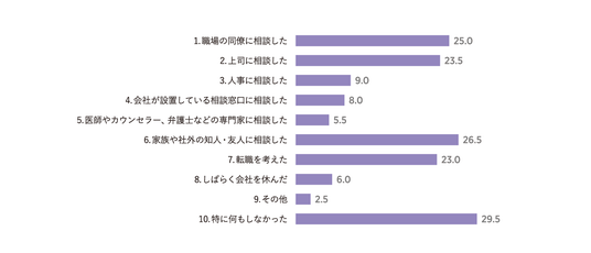 ・また、4人に1人は「2.身近に相談できる人がいなかったから」を選択した。「3.社内に相談できる窓口や担当部署がなかったから」「5.どうしたらいいか分からなかったから」という回答も一定数あった。