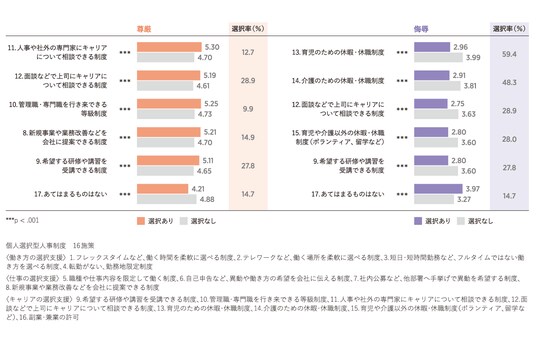 ・働き方やキャリアに関して主体的に選択する機会を提供する個人選択型人事制度の会社への導入有無を尋ね、制度の導入有無が職場の尊厳に関係するのかを確認した。「尊厳」の得点差が大きい5つの施策は、「11.人事や社外の専門家に/12.面談などで上司にキャリアについて相談できる制度」「10.管理職・専門職を行き来できる等級制度」「8.新規事業や業務改善などを会社に提案できる制度」「9.希望する研修や講習を受講できる制度」であった。