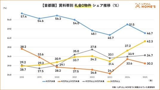 LIFULL HOME'S首都圏の礼金0物件シェア推移2025年