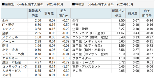パーソルキャリア株式会社が運営する転職サービス「doda(デューダ)」(編集長:桜井 貴史)は、2025年10月の転職求人倍率をまとめた「doda転職求人倍率」を発表いたします。