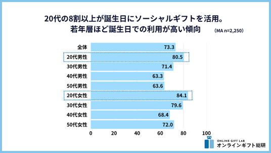 A. 20代女性の84.1%、20代男性の80.5%が誕生日にソーシャルギフトを贈っています。これは全体平均の73.3%を上回る数値です。
