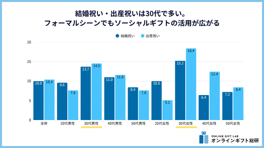 30代は多くの人にとって自身や周囲の友人・知人が結婚や出産などのライフイベントを経験するタイミングであり、その人生の節目でのお祝いが重なっていることが影響しているのかもしれません。