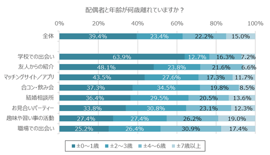 「友人からの紹介」(48.1%)や「マッチングサイト/アプリ」(43.5%)も、年の差前後1歳以内の割合が高くなりました。