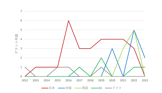 国別の件数では、比較的早期から時間結晶領域への賦与が確認される日本がもっとも多く、直近で急伸している米国、英国、さらにEU、ドイツが続いています。