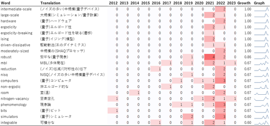 キーワードごとの成長率(growth)は、2012年以降の文献中における出現回数と、2021年以降の文献中における出現回数の比で定義され、値が1に近いキーワードほど直近での出現頻度が高いといえます。