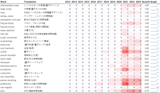 一方、「NISQ」(ノイズの多い中規模量子デバイス)など実用化への過渡期にある現在の量子コンピューティングに関するキーワードや、「resources」など量子計算資源や量子センサ資源に関するキーワードが2021年以降に出現傾向が強まっています。時間結晶特有の堅牢な量子状態を適切に制御する技術を確立し、長期安定動作および大規模化が可能なノイズに強い量子デバイス(コンピュータチップやセンサなど)を実現しようとする最近の新規研究の傾向が見てとれます。