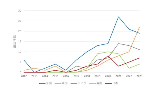 国別では米国の件数が期間全体でもっとも多く、直近で急伸している中国、さらにドイツや英国、日本が続いています。