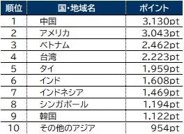 [2] 各国・地域のポイントは、調査の際に検討の可能性がある国・地域について1位~3位までの順位を付けた回答の結果に基づいて集計したものである。順位ごとにポイントを付与し、1位は5pt、2位は3pt、3位は1ptとして、合計ポイントを算出した