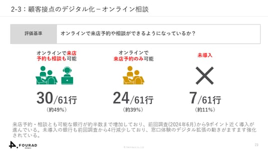 - 前回調査から来店予約・相談とも可能な銀行は9ポイント増加し、全体の約49%となった。未導入の銀行も前回調査から4行減少し、窓口体験のデジタル拡張の動きがますます強化されている