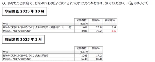 - お米の代わりによく食べるようになったものは「特にない・今までと変わらない(76.2%)」が最多。「ある(23.8%)」は前回調査よりも+6.6%増加。具体的な品目は「パン」「うどん」「パスタ」など。