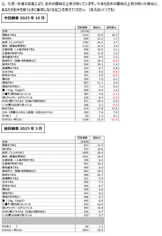 また、価格上昇が続いたときに重視しなくなることについて尋ねたところ、「銘柄(34.2%)」「国産米である(22.0%)」「産地21.9%」が回答の上位にランクインしました。前回調査では「わからない」が第1位(33.9%)だったのに対して、今回調査では「わからない」は第4位(21.5%)にランクダウンしています。米の需給混乱・価格高騰が続く中で、消費者の心裡では「どのこだわりを捨てるべきか」が徐々に明確になりつつあることを感じさせる結果となりました。