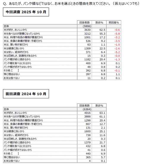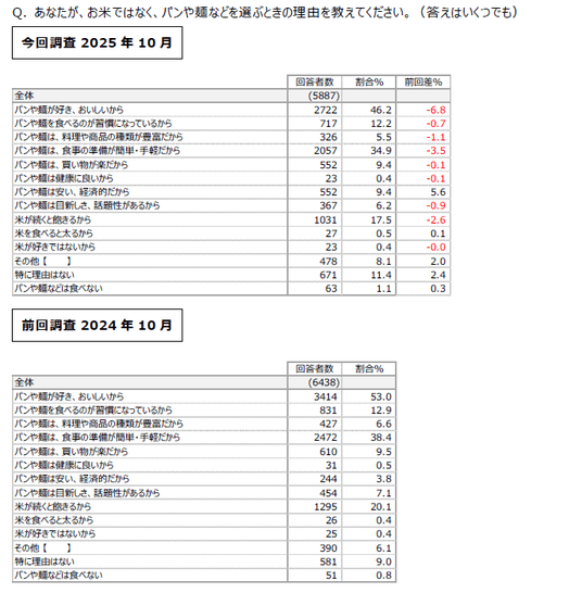 お米ではなく、パンや麺などを選ぶときの理由について尋ねたところ、「パンや麺は安い、経済的だから(9.4%)」は+5.6%増加しました。選ぶ際に安さ・経済性を理由とする点については、調査開始以降初めて、「米(6.4%)」を「パンや麺(9.4%)が逆転する結果となりました。