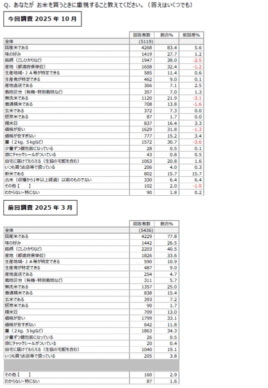 お米を買うときに重視することについて尋ねたところ、「国産米である(83.4%)」、「銘柄(38.0%)」、「産地(32.4%)」、「価格が安い(31.8%%)」が回答の上位にランクインしました。前回調査と比較すると、「国産米である(83.4%)」は5.6%増加しました。「銘柄」は2.5%減少、「産地」は1.2%減少、「価格が安い」は1.3%減少しており、米の需給混乱・価格高騰が続く中で、「米はせめて原産地だけでも国産にこだわりたい」という消費者の心裡が読み取れる結果となりました。