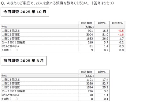 日本生協連では引き続き、主食であるお米の利用実態を把握し、生産者と産地との取り組みや応援に役立てるとともに、組合員の日々のくらしを支援することを目的として、全国の組合員を対象としたWEBアンケートを実施しました。(調査期間:2025年10月9日~10月14日、有効回答数:5,887件)