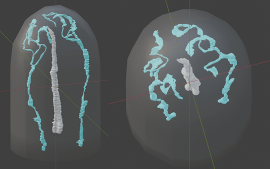 図2. 五型ニューロンの三次元像を横から見た図(左)と真上から見た図(右)。青色で示されているのが五型ニューロン。白色で示されているのが口針。五型ニューロンは上部で複雑に分岐し、表層付近まで伸展している。