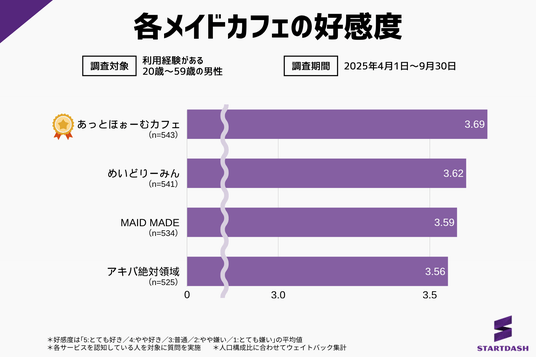 調査の結果、4ブランド全てが「普通」を大きく上回る3.5以上の高い平均スコアを獲得しました。最も高い評価を得たのは『あっとほぉーむカフェ』で3.69、次いで『めいどりーみん』が3.62、『MAID MADE(メイドメイド)』が3.59、『アキバ絶対領域』が3.56と続きます。