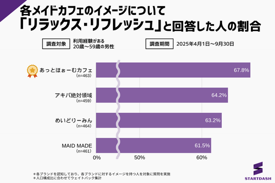 恋愛相談SNSアプリ「kyuun(キューン)」を開発・運営するSTARTDASH株式会社( https://startdash.co.jp/ )(本社:大阪府大阪市、代表:田中将)は、メイドカフェ利用者の店選びのヒントを探るため、メイドカフェの利用経験がある20歳~59歳の男性を対象に、人気4ブランドのイメージに関する調査を行いました。