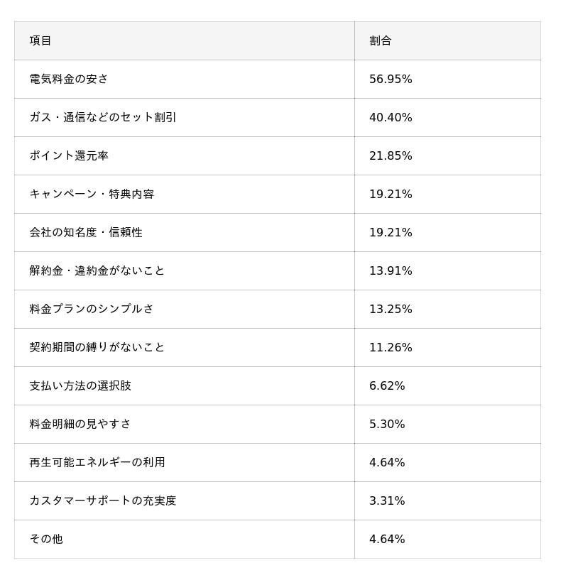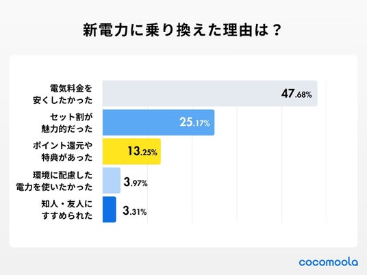 - 乗り換えの理由と、乗り換える電力会社を選ぶ際に最も重視したポイントのどちらも「電気料金を安くしたかった」(47.68%)、「電気料金の安さ」(56.95%)がトップとなり、利用者の最大の動機が電気代の節約にあることが明確になった。
