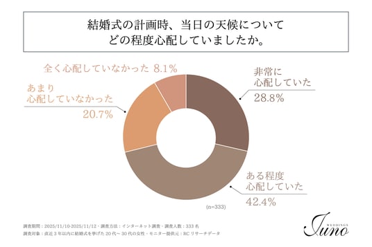 直近3年以内に結婚式を挙げた20代~30代の女性の7割以上が、程度の差こそあれ当日の天候を心配していた