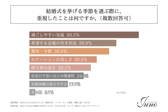 また、「結婚式を挙げる季節を選ぶ際に、重視したことは何か」を尋ねる設問への回答では、1位が「過ごしやすい気温」で50.5%、2位が「希望する会場の空き状況」で39.9%、3位が「費用・予算」で36.6%という結果になりました。この結果から、結婚式を挙げる季節を選ぶ際に、直近3年以内に結婚式を挙げた20代~30代の女性の最も多くが重視したのは「過ごしやすい気温」であったことがわかりました。