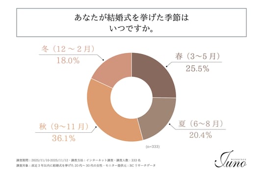 直近3年以内に結婚式を挙げた20代~30代の女性が、挙式を行った季節として最も多いのは「秋(9月~11月)」