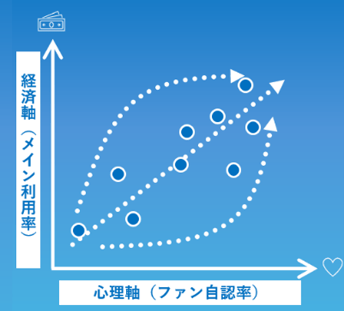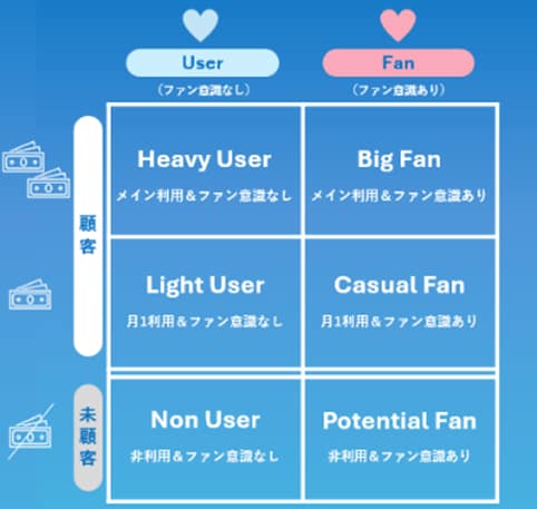 心理軸と経済軸で顧客を6つのセグメントに分類し、顧客構造を捉えることができるファン構造フレームワークです。左右を「心理=ファン意識の有無」、上下を「経済=ブランドやサービス等に対する行動量」として顧客を6分類しています。