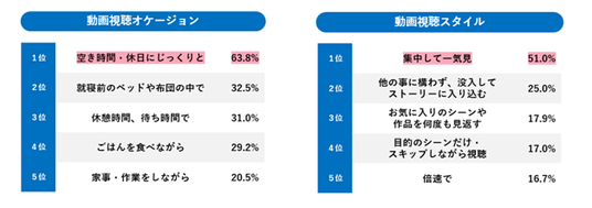 動画視聴スタイルは、全世代において「じっくり・集中して一気見」派が大半を占めています。視聴時間帯も21時~22時が多く、1日の終わりにじっくりと動画を見る人が多い傾向。タイパを意識した、“倍速視聴”や“ながら視聴”よりも、じっくり時間を掛けて視聴するスタイルが主流となっています。