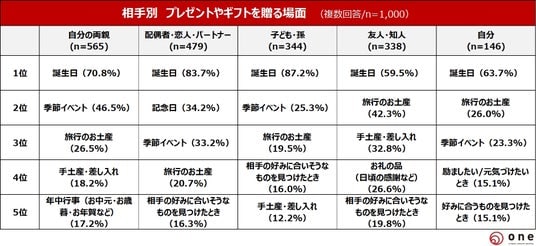 マーケティング支援事業を手掛ける株式会社one(本社:東京都新宿区、代表取締役CEO:清水佑介)は、全国の10代~60代の男女1,000人を対象に「プレゼント・ギフトに関する調査」を実施しましたので発表いたします。