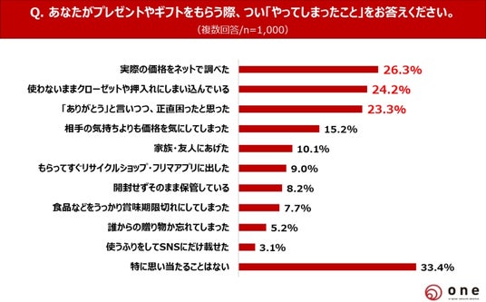 プレゼントやギフトをもらう際、つい「やってしまったこと」TOP3は、1位「実際の価格をネットで調べた」26.3%、2位「使わないままクローゼットや押入れにしまい込んでいる」24.2%、3位「『ありがとう』と言いつつ、正直困ったと思った」23.3%でした。4人に1人以上が、もらった品物の価格を調べたことがあると判明しました。