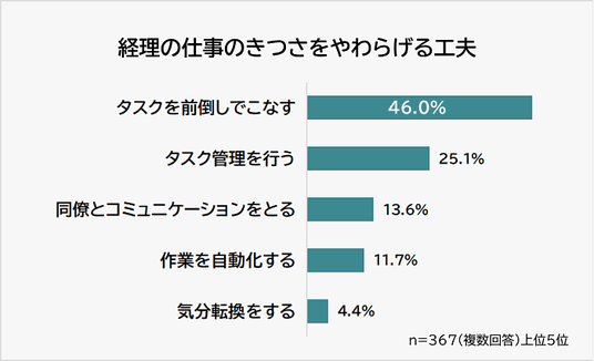 経理の仕事のきつさをやわらげる工夫として圧倒的に多かった回答は「タスクを前倒しでこなす(46.0%)」でした。2位は「タスク管理を行う(25.1%)」となっています。